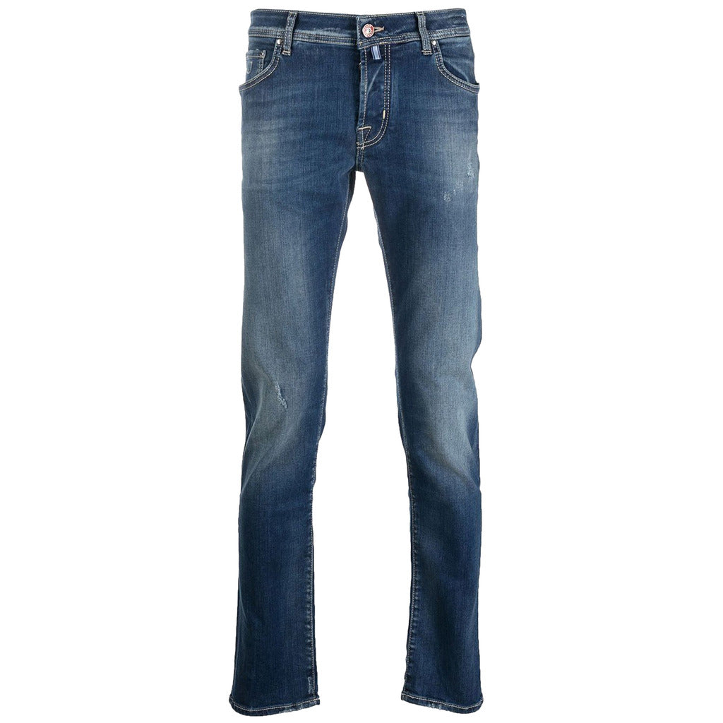 Jeans Jacob Cohën Nick super slim fit in denim blu lavato con cuciture grigie, cinque tasche, chiusura con bottoni e bottone decorativo rosso. Toppa in cavallino rosso con logo laserato