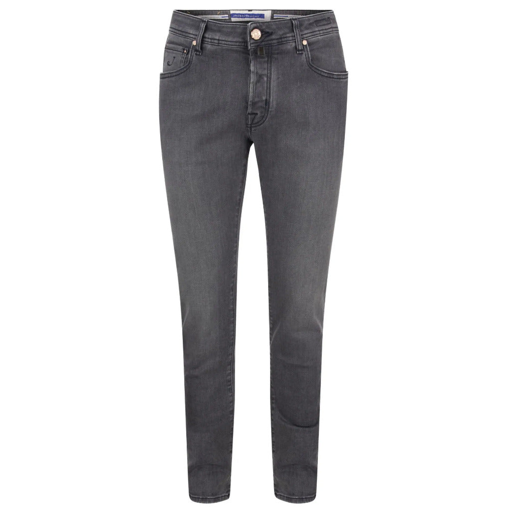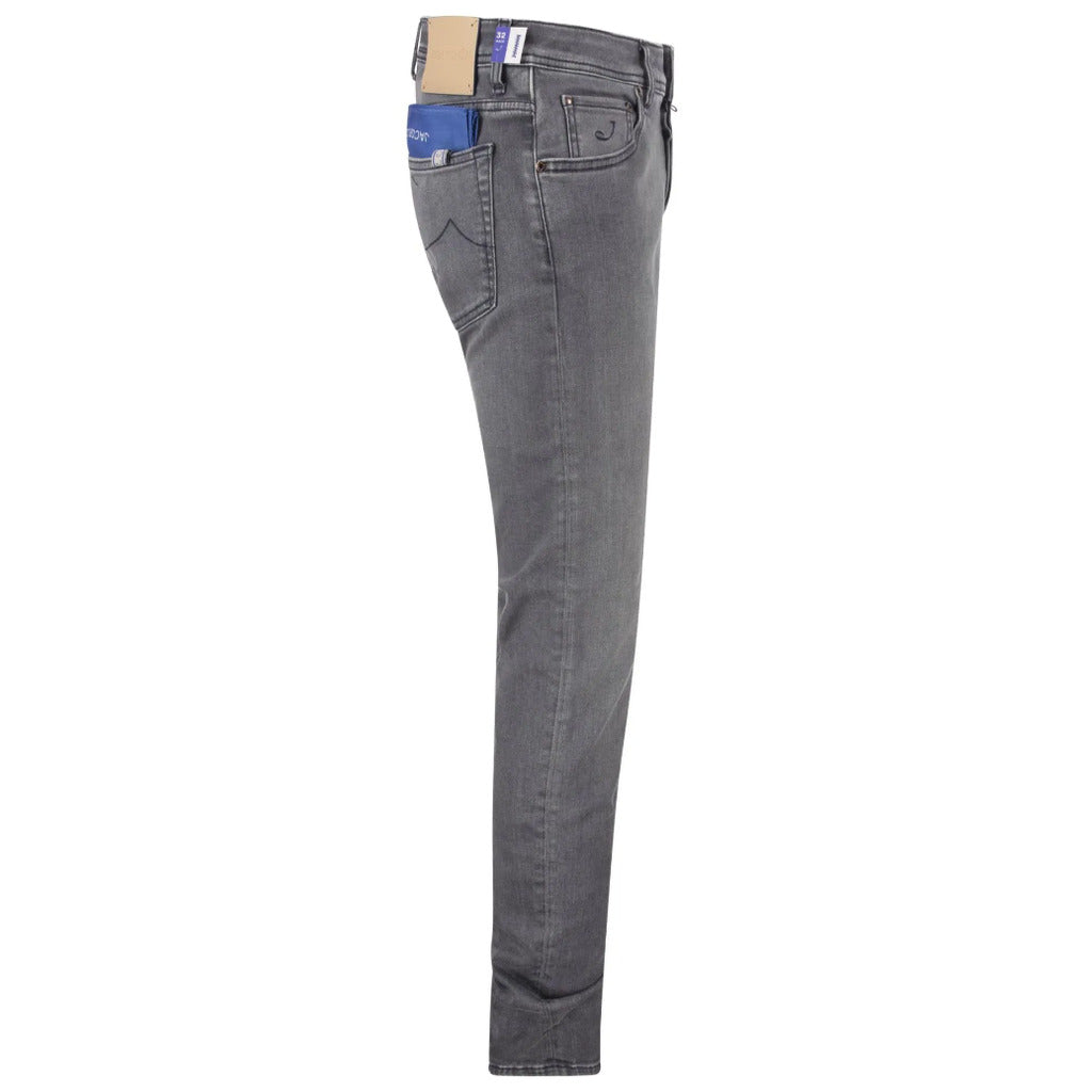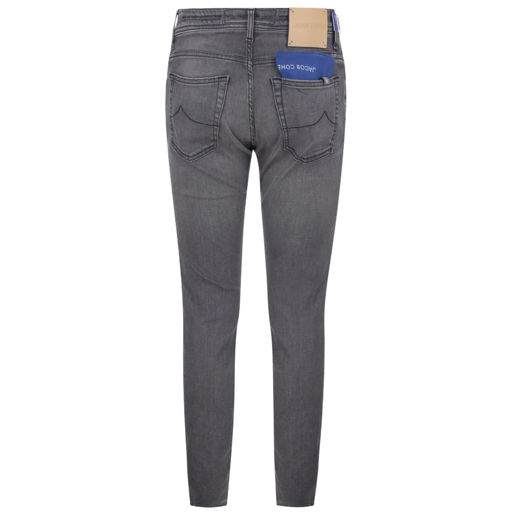 Jeans slim fit Jacob Cohën Nick in denim grigio con cuciture grigie, cinque tasche, chiusura con bottoni e bottone argentato. Toppa con logo in vitello beige