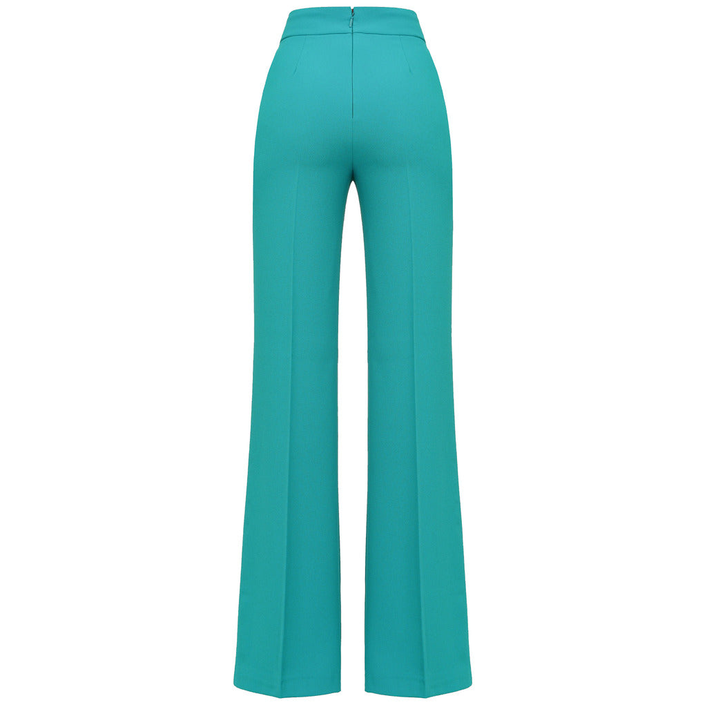 Pinko flare silhouette pants with flared leg at the bottom, in monochrome stretch crepe. High waist with golden side buttons and French pockets in front. Invisible zipper closure in center back.