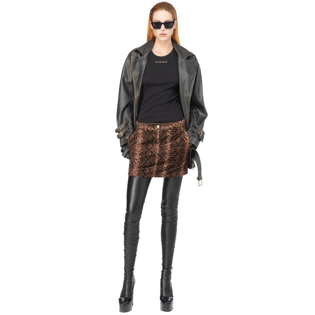 Pinko straight-cut corduroy miniskirt with snake print. Belt loops and slanted side pockets. Metal zip closure and stud button.