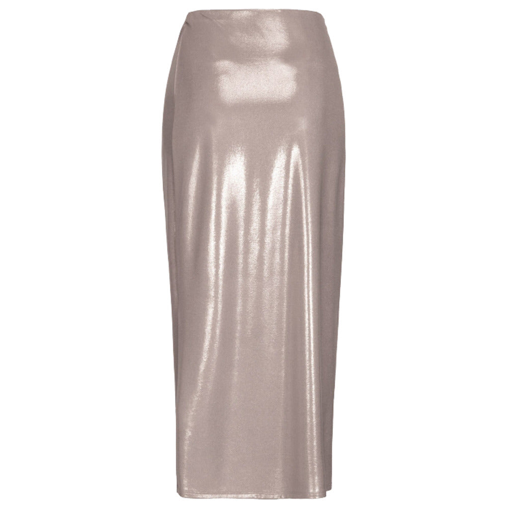 Pinko draped sarong midi skirt in laminated stretch jersey with a special wet effect. Gathered side detail at the waist, which creates movement on the front and opens into a slit.