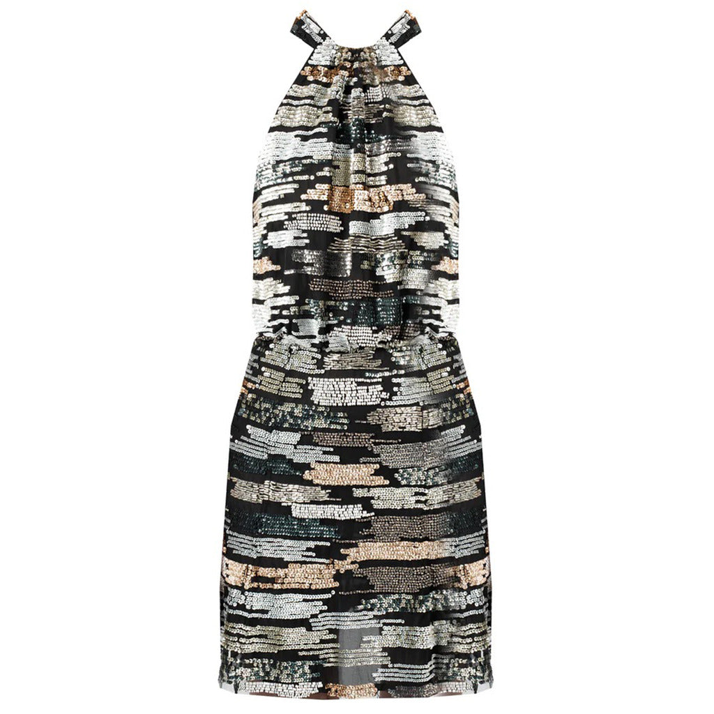 Pinko mini dress in tulle entirely embroidered with gold cream silver sequins. Off shouders. High collar and ties at the back.