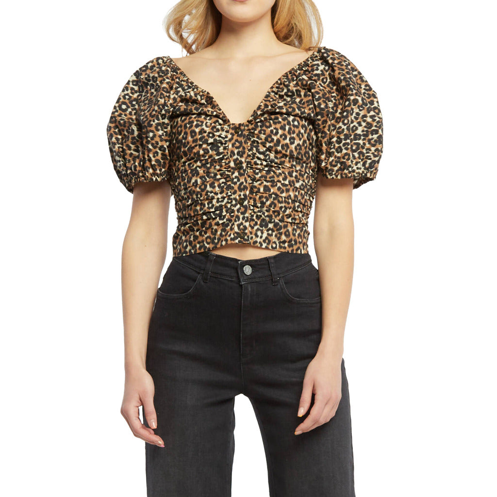 Pinko cotton top with spotted print and balloon sleeves, elasticated V-neck and button fastening