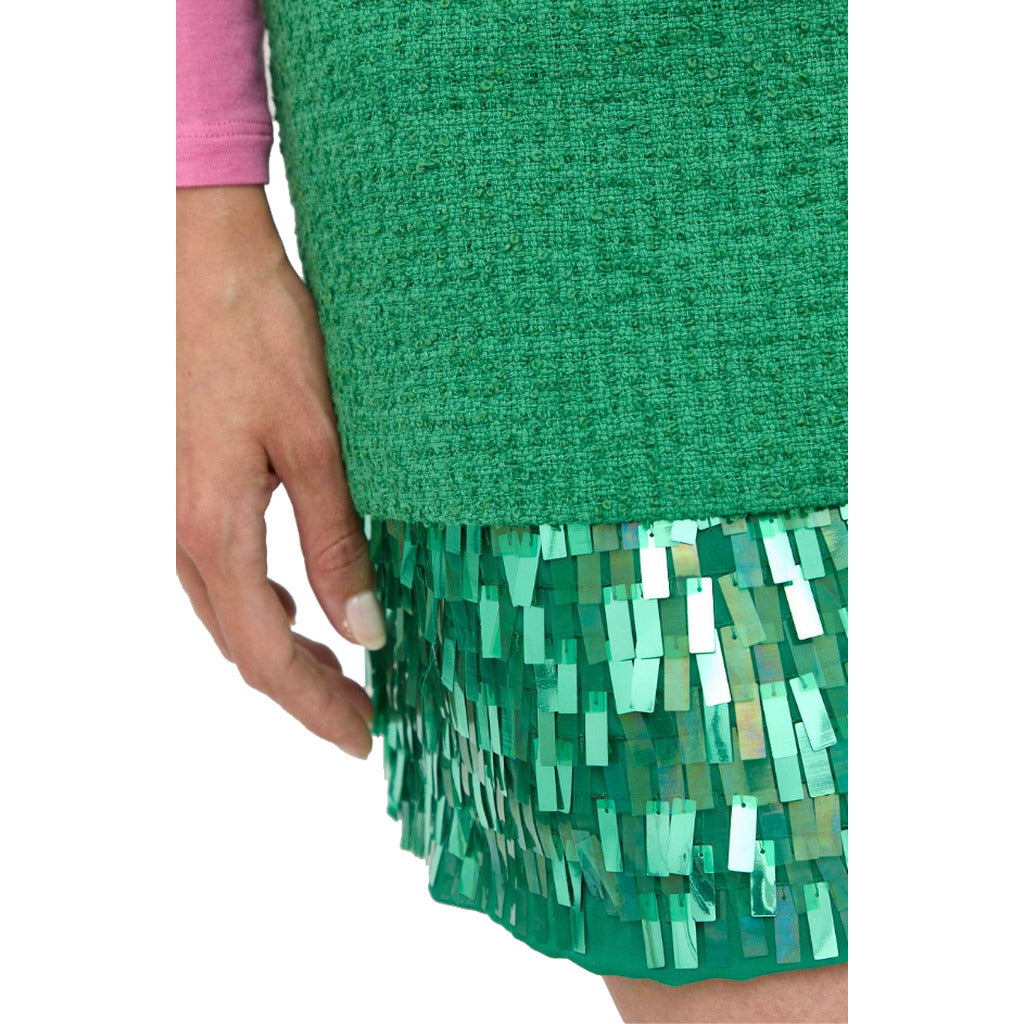 Pinko short skirt made of cotton blend mat boucle, lined inside, applied sequins on the end of the lining, back zipper closure