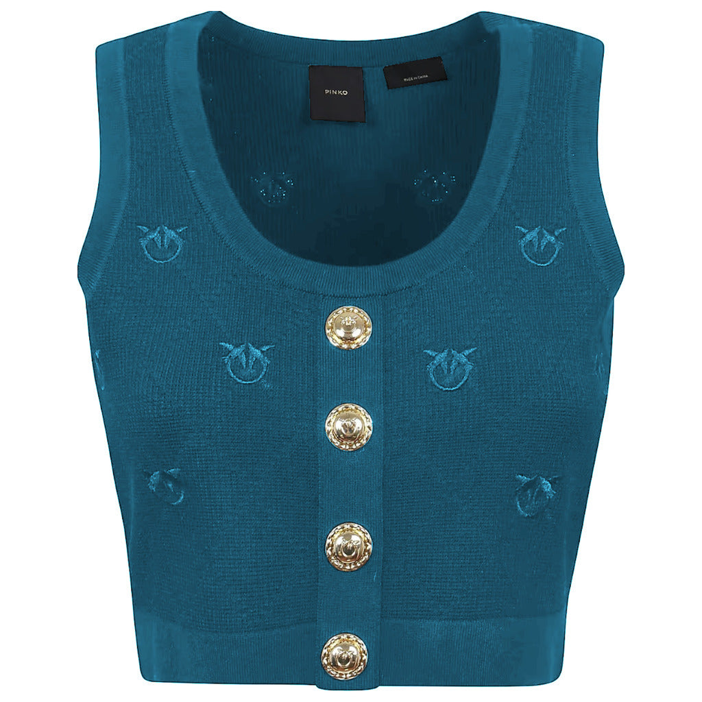 Pinko sleeveless viscose blend top with decorative gold buttons and logo embroidery across the entire surface