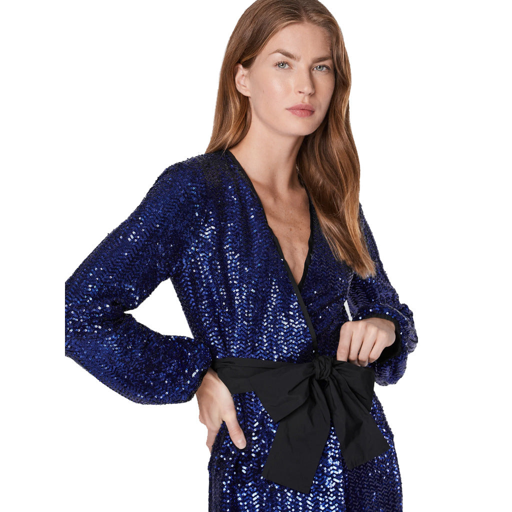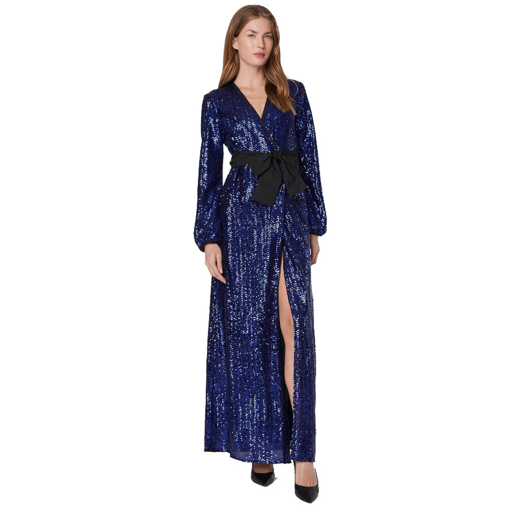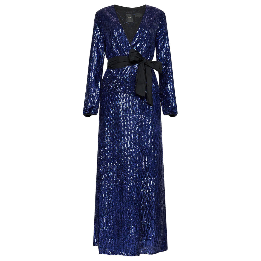 Pinko long evening dress entirely embroidered full paillettes. V-neck closed at the waist with matching belt and long sleeves. Lined.