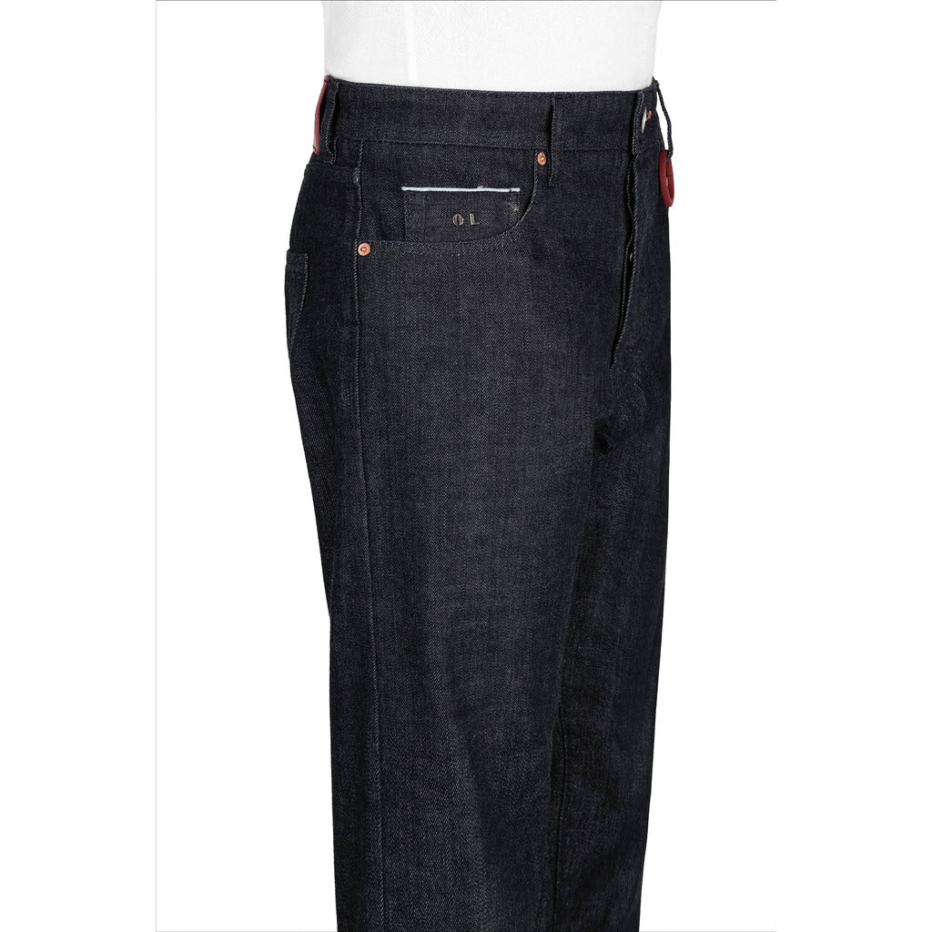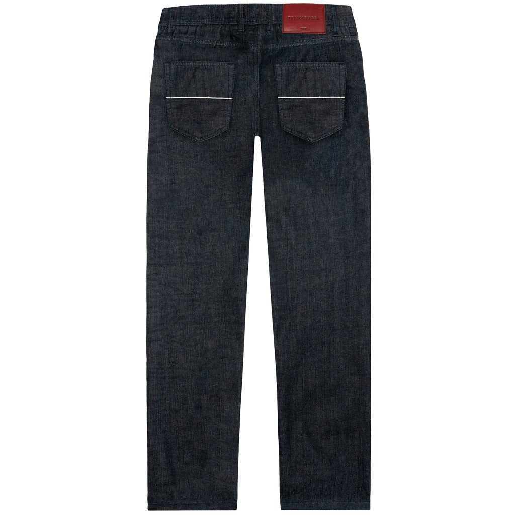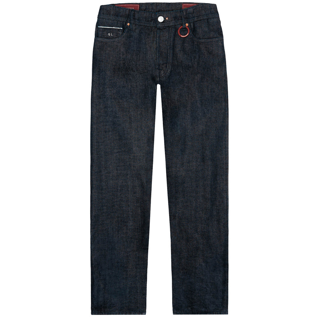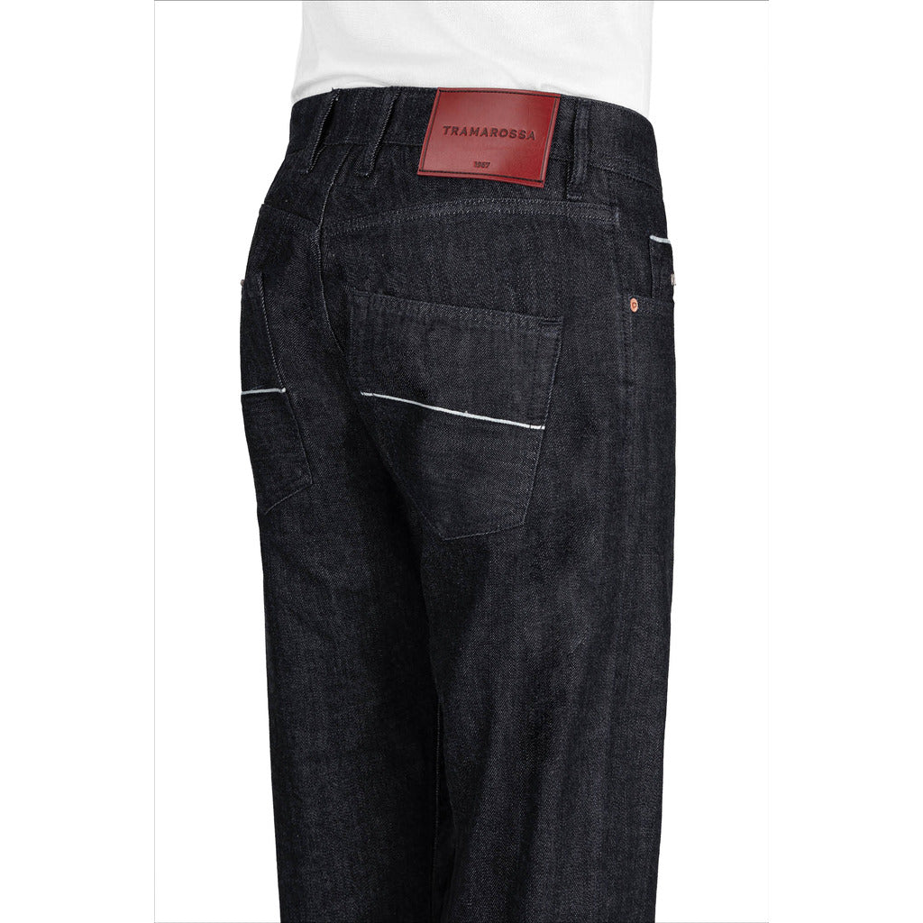 Tramarossa jeans, Dante Selvedge model, in dark blue cotton, five pockets with removable initials on the pocket, front button fastening. The model is enriched with new exclusive details, above all the new back label in refined red leather.