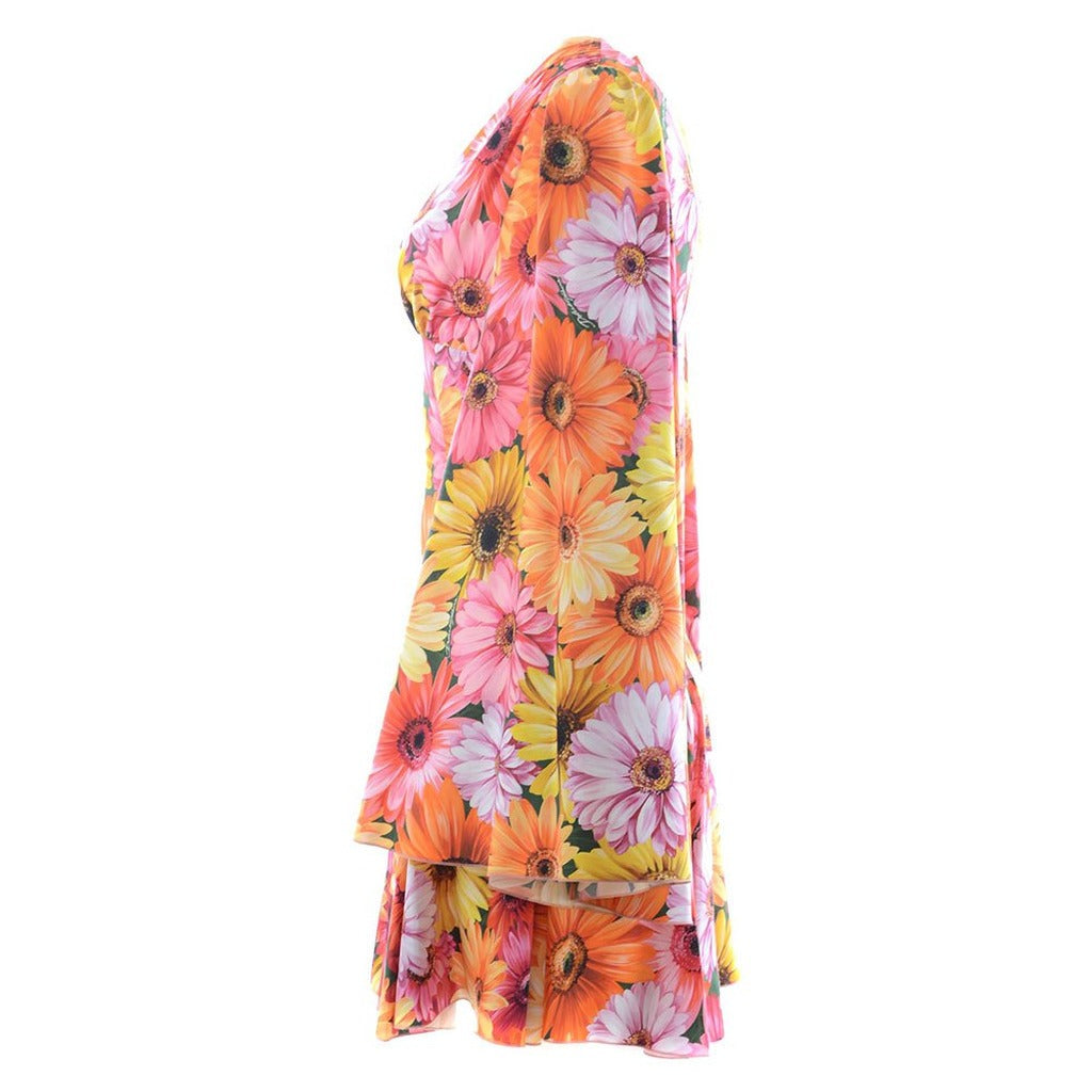 Dolce & Gabbana short long-sleeved dress with multicolored Daisy Flowers print, V-neck, zip closure on the back