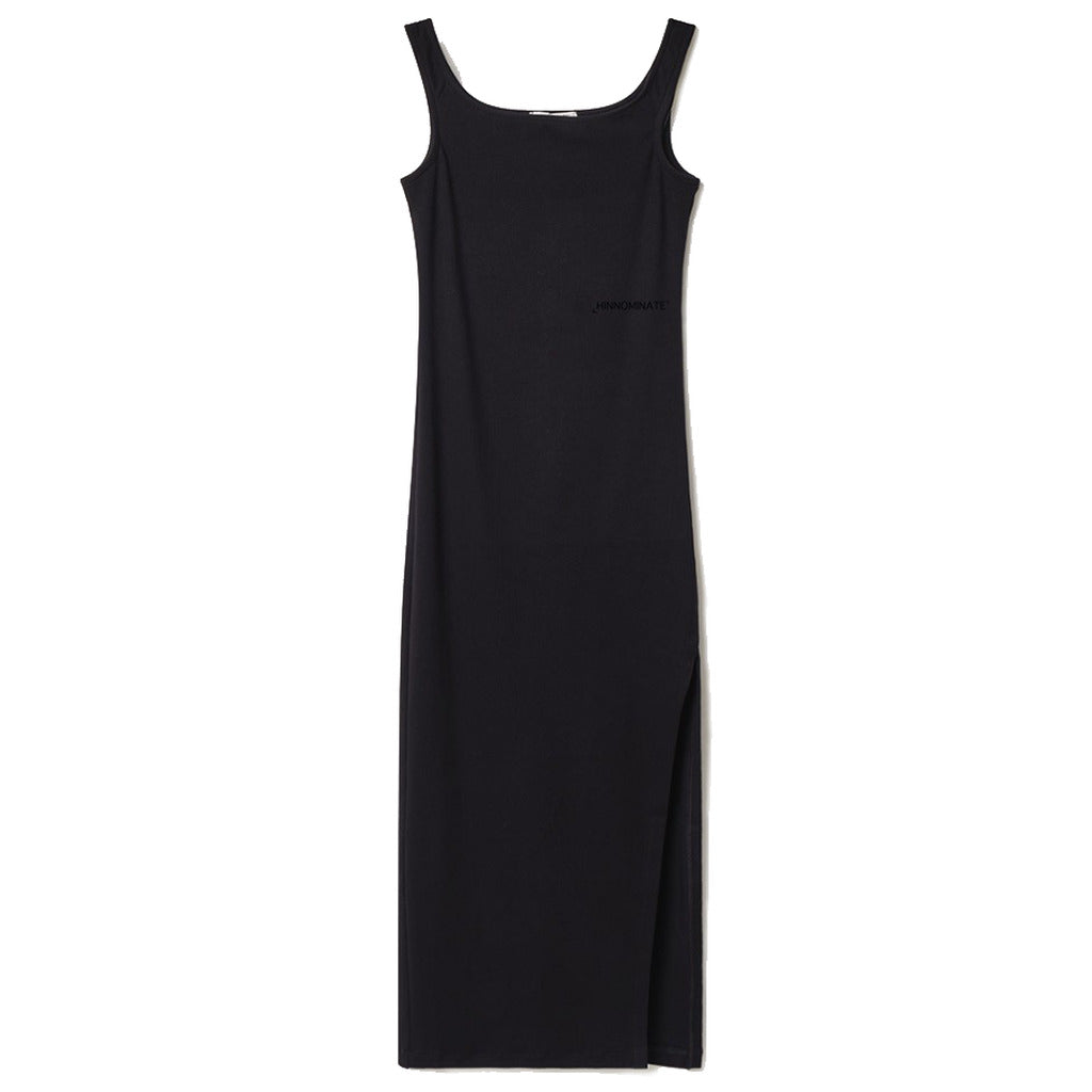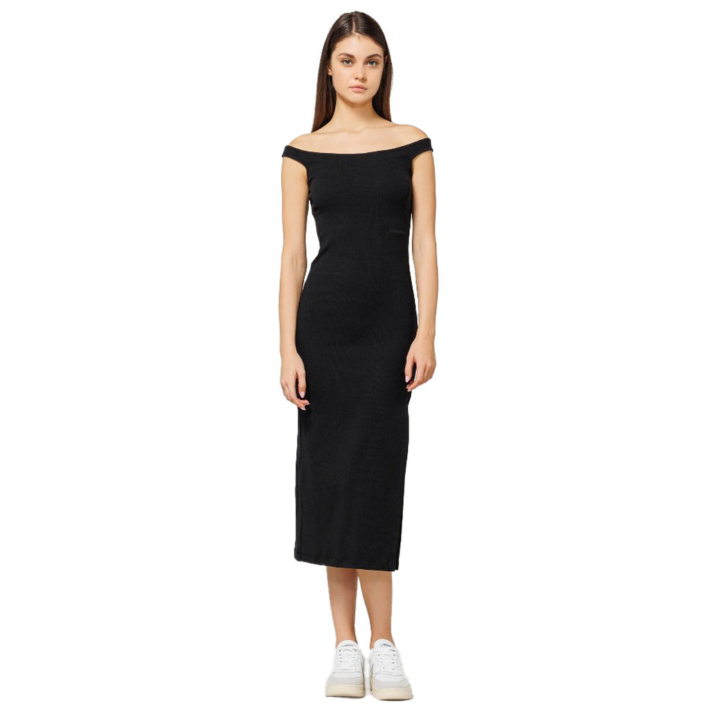 Hinnominate long rib dress with off-the-shoulder cutouts and side slits, rubber logo on the chest