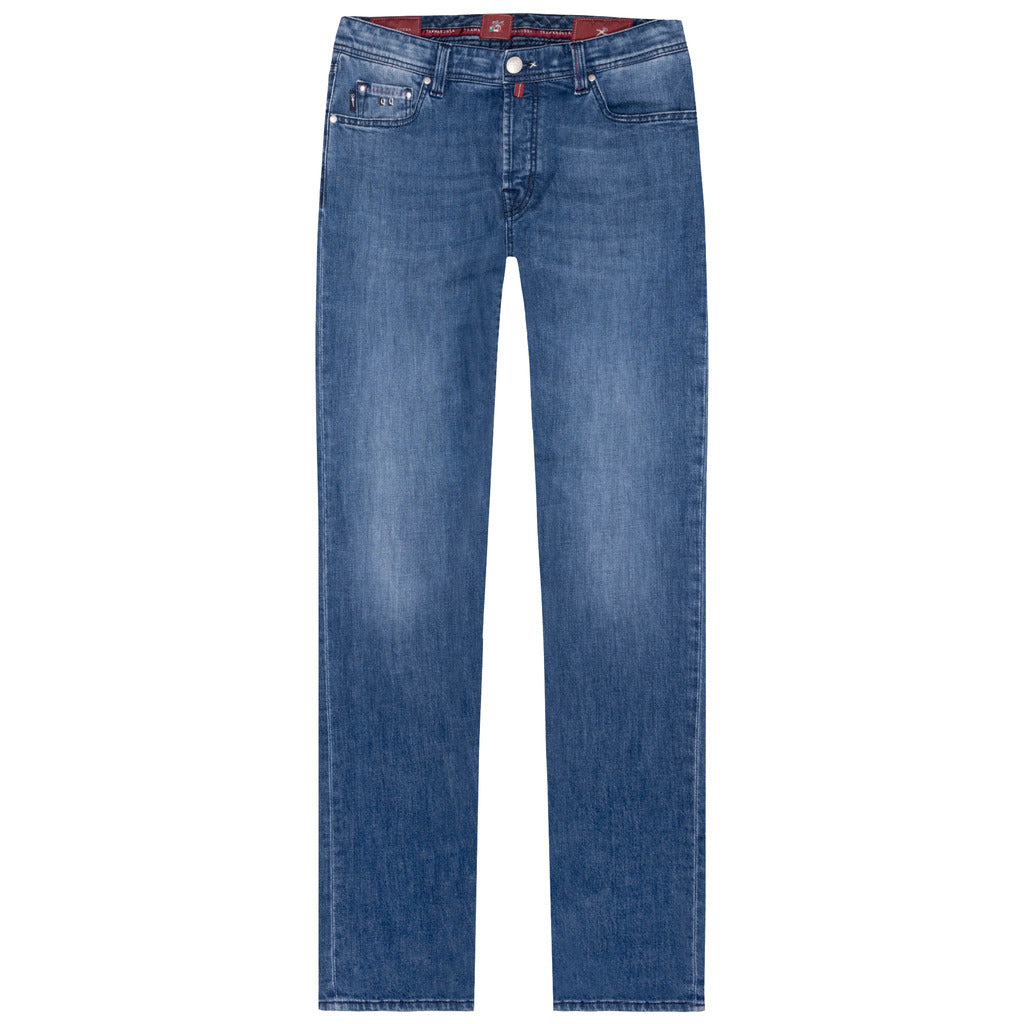 Tramarossa haute couture men's jeans in slightly stretch cotton, regular fit, five-pocket model, blue suede label with logo on the back