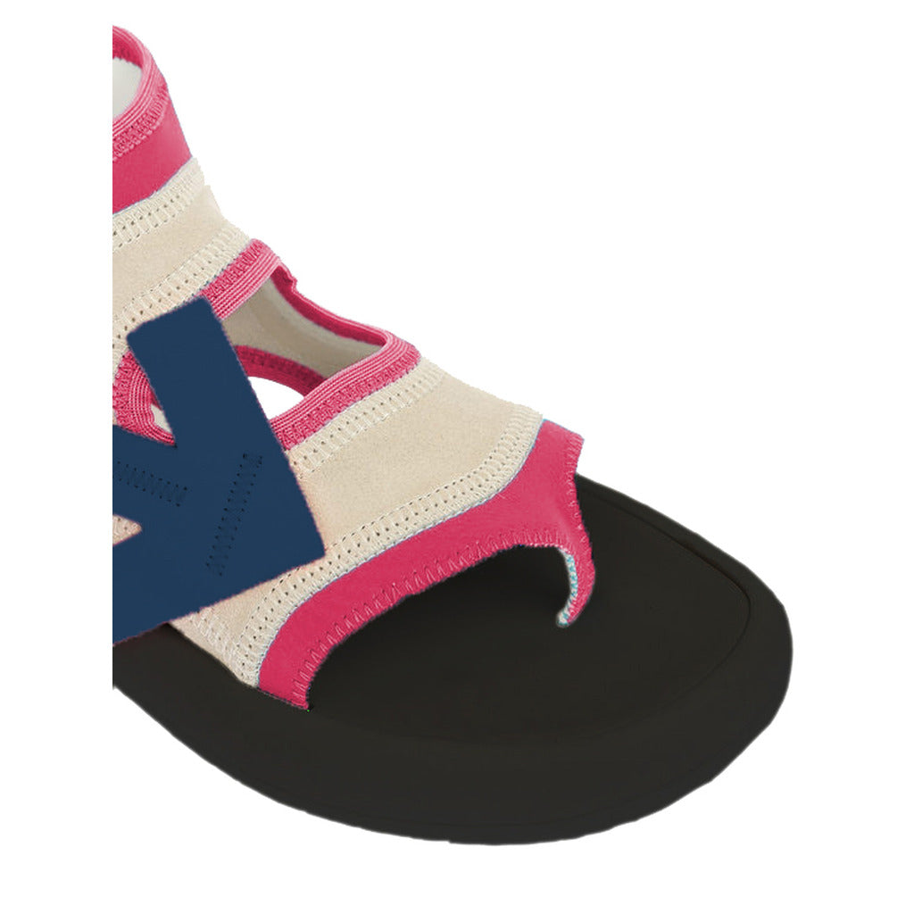 Off-White neoprene and suede sandals. Rounded open toe, zip closure along the side, rubber sole, leather arrow logo.