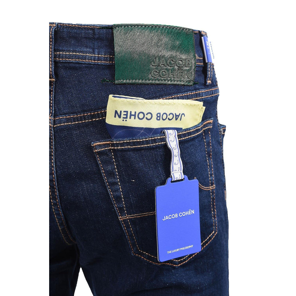 Jacob Cohën Bard slim fit jeans in dark denim in stretch cotton with a dark green pony hair logo patch on the back, gold stitching details. The mid-rise design features belt loops, a front fastening with decorated buttons, a slim fit and classic five pockets.