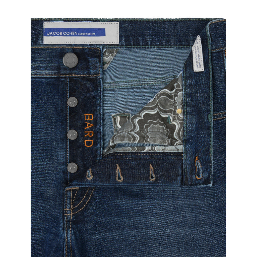 Jacob Cohën Bard jeans in slightly stretch cotton, five pockets, button fastening, gold-coloured stitching details, blue pony skin logo patch