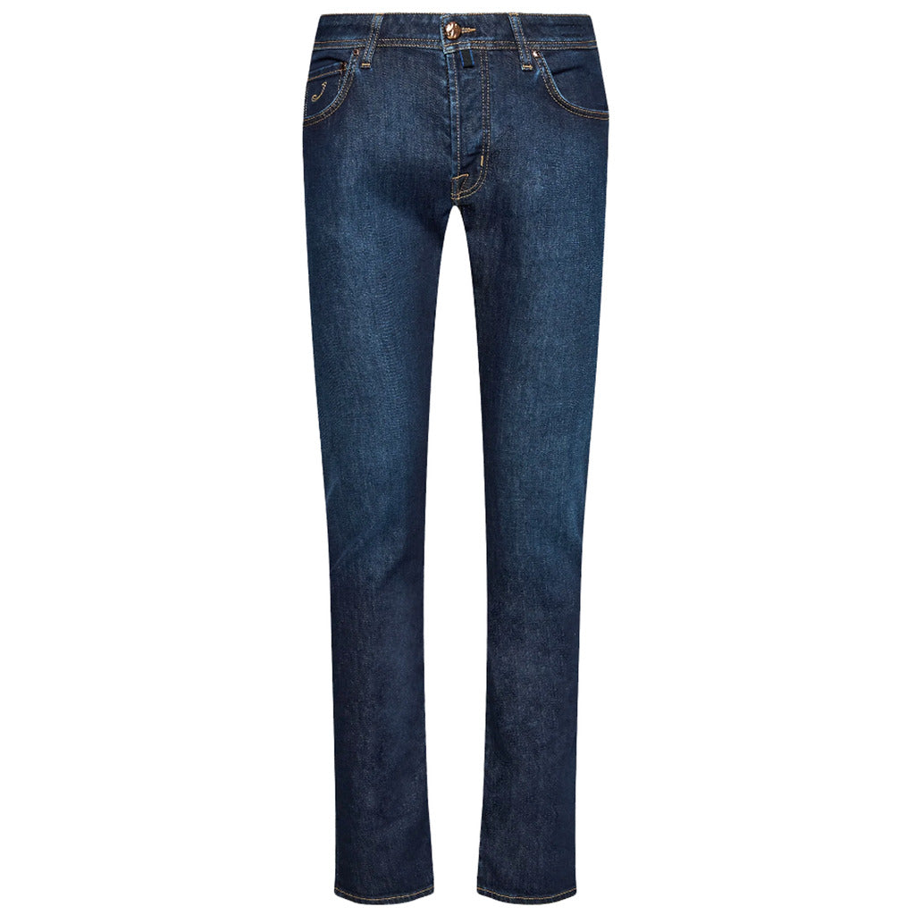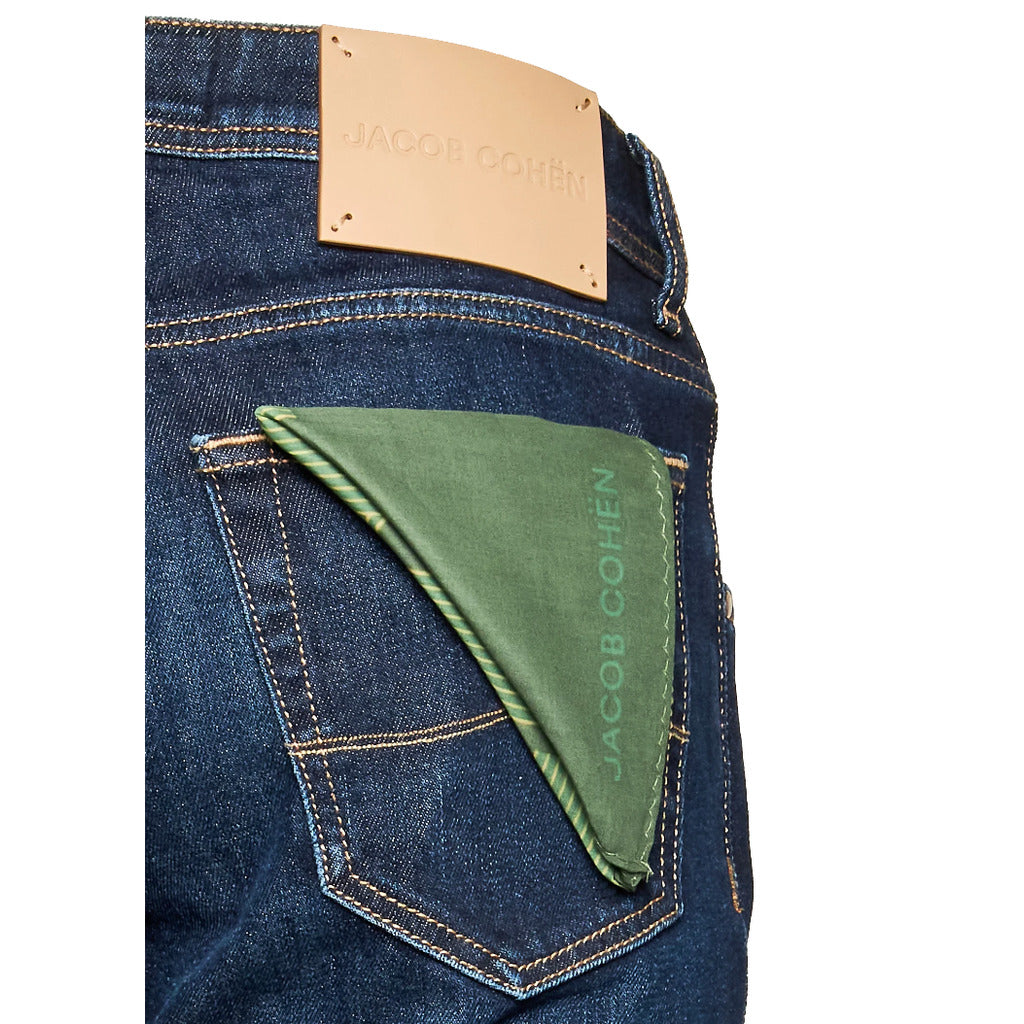 Jacob Cohën Nick slim fit jeans in dark blue denim with gold stitching details, five pockets, button fastening and silver button. Beige calfskin logo patch