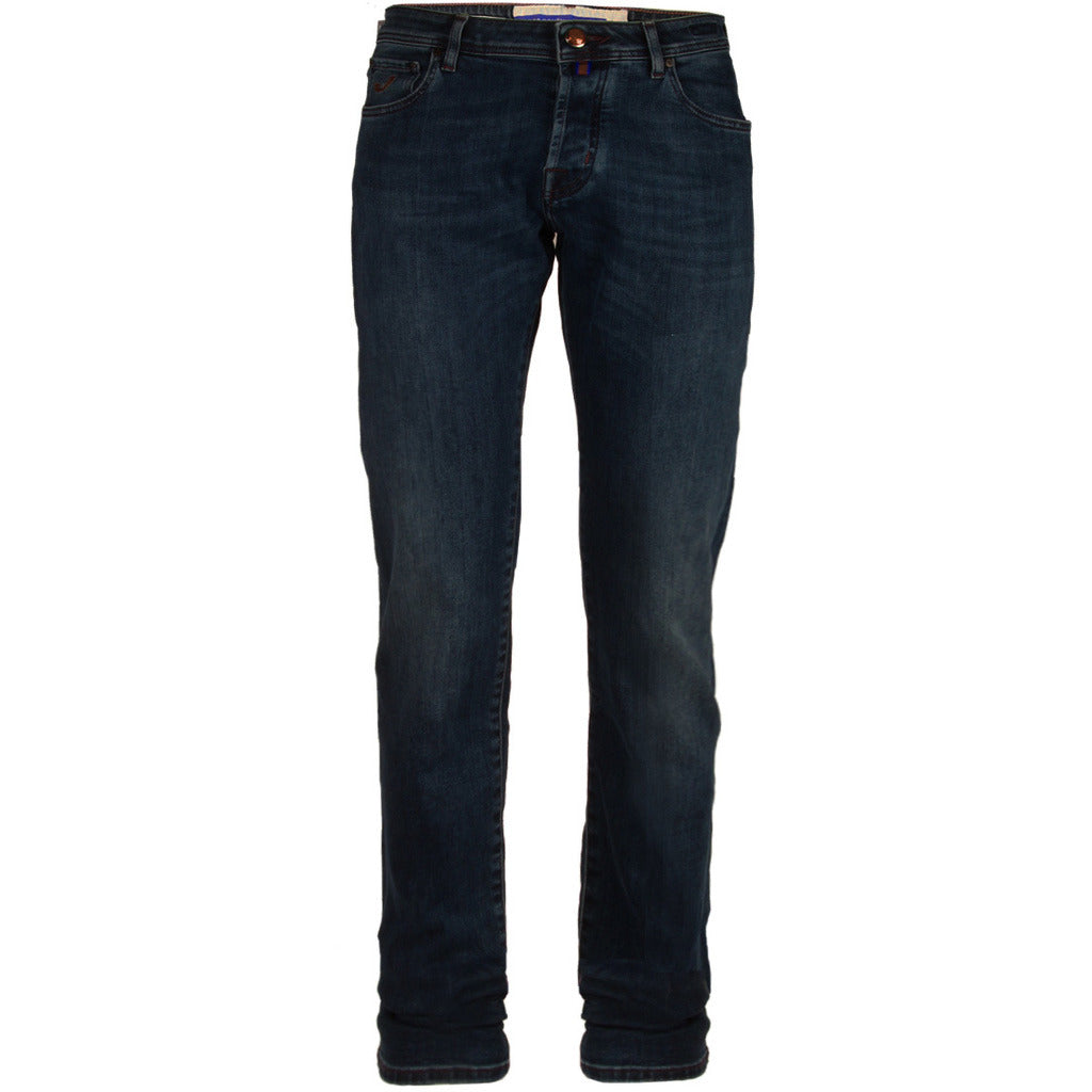 Jacob Cohën Bard slim fit jeans in dark blue denim, five pockets, button fastening and brown decorative button. Brown suede logo patch